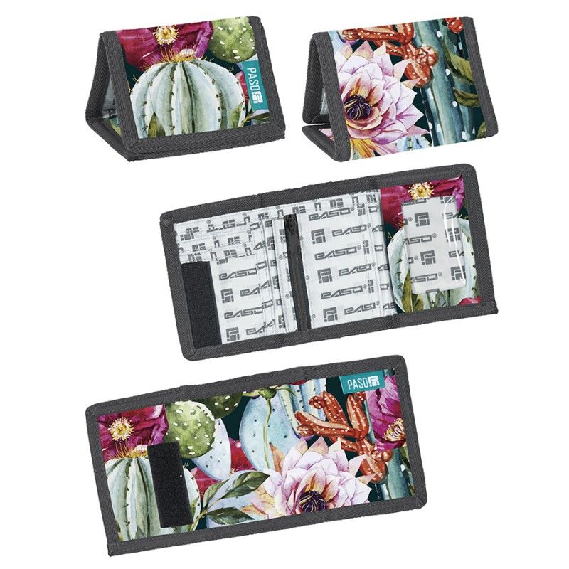Портмоне със закопчаване с велкро. Вътре има джоб за монети с цип, едно отделение за банкноти и допълнителни отделения.