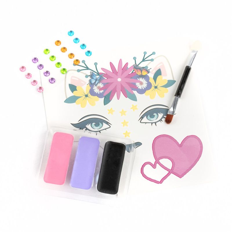 Бои за лице с мотив на сладко котенце. Комплектът включва три цвята: лилав, розов и черен, четка с два края, комплект от четири татуировки и пет вида диаманти за допълнителен блясък. Този грим е идеален за различни тематични партита, като карнавал или Хелоуин. Татуировките са трайни и безопасни за кожата, потвърдено от подходящи лабораторни тестове, и могат лесно да се премахнат с бебешко олио след игра.