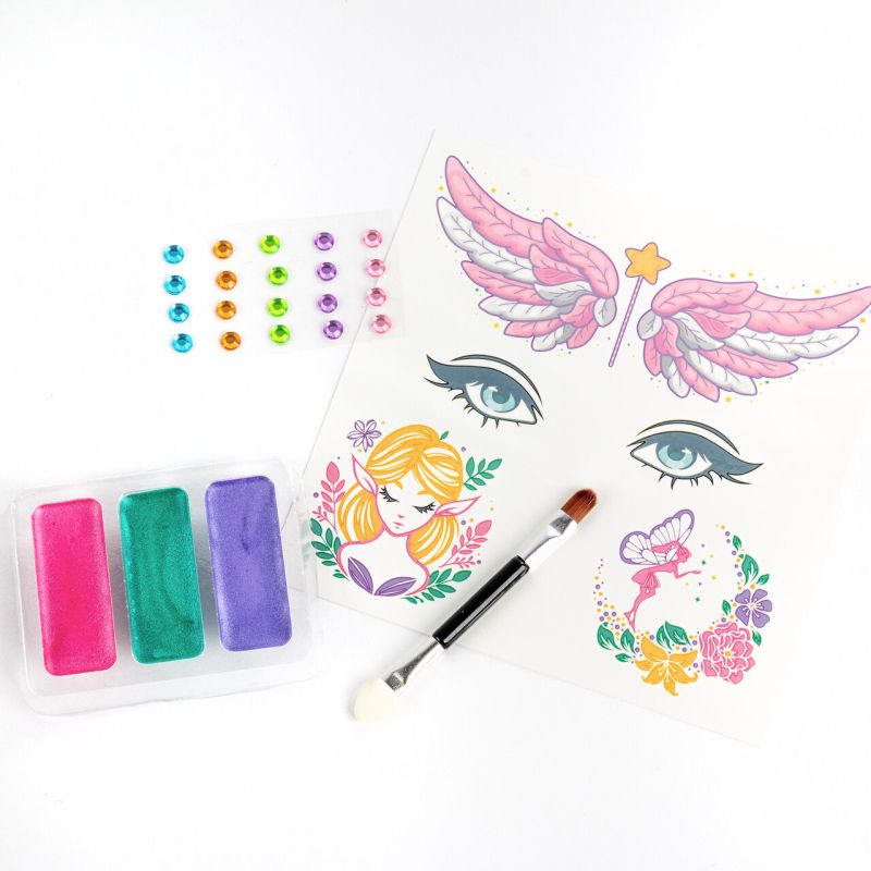 Бои за лице с лепенка с мотив на сладка фея. Комплектът включва три цвята: зелен, розов и лилав, четка с два края, комплект от четири татуировки и пет вида диаманти за допълнителен блясък. Този грим е идеален за различни тематични партита, като карнавал или Хелоуин. Татуировките са трайни и безопасни за кожата, потвърдено от подходящи лабораторни тестове, и могат лесно да се премахнат с бебешко олио след игра.