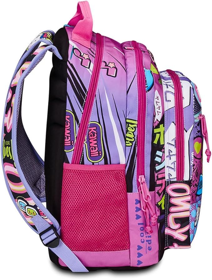 Висококачествена, ултра лека раница, изработена от водоустойчив материал. Разполага с 3 големи отделения и допълнителен джоб отпред за аксесоари. Гърбът и основата са подплатени с EVA, за да поддържат цялата тежест, дори когато детето бяга. Раменните презрамки са широки и меки в гъвкав пенопласт, а формата се адаптира към ширината на раменете. Раницата има два странични джоба от неопрен. Водоустойчив плат