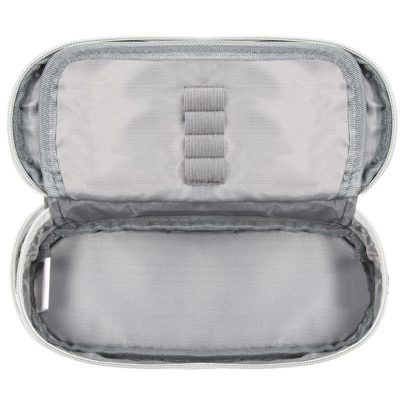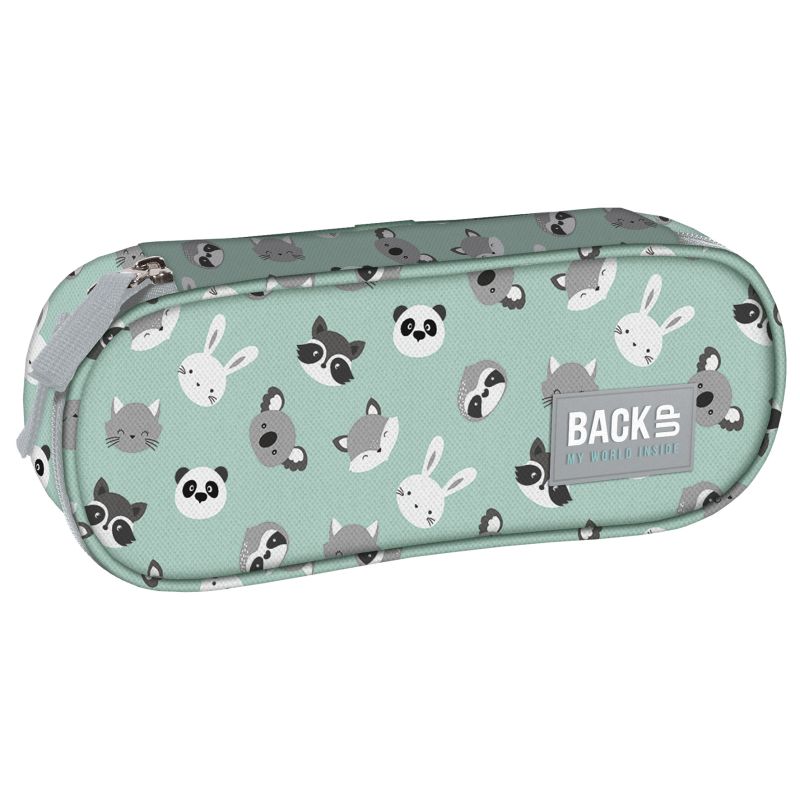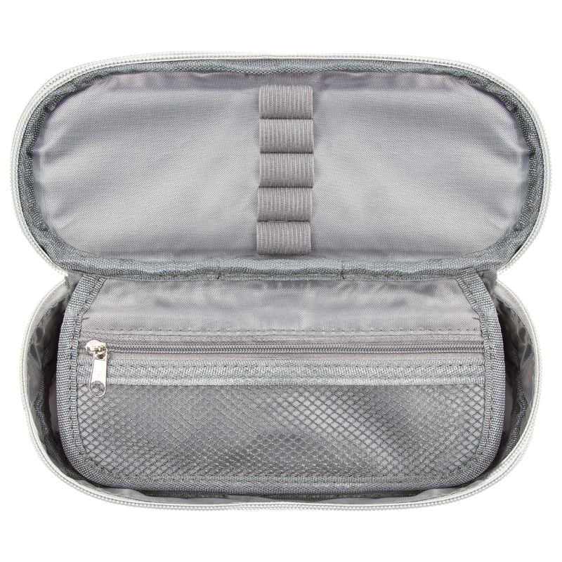 Овален несесер с едно просторно отделение и допълнителна клапа с ластичета за ученически принадлежности.