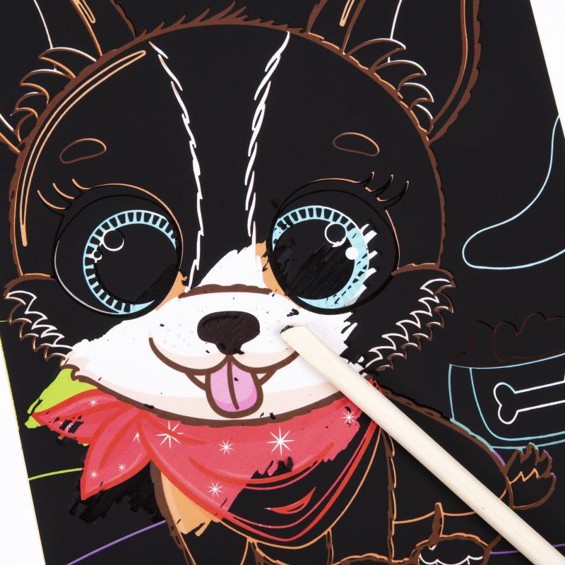 Скреч игра Куче - комплект от 6 листа с различни илюстрации. Използвайки бамбуковия стилус, включен в комплекта, можете да откриете рисунки в интензивни цветове, които са скрити под черния слой. Той е изключително лесен за използване, което го прави идеален за деца, които тепърва започват своето приключение с изкуството. Това е изключително пристрастяващо забавление. А ефектът е невероятен, което ще бъде страхотно забавление за децата. Накрая творбата може да се окачи на стената в детската стая, защото картите са много твърди. Идеална идея за подарък за всеки малък творец!
