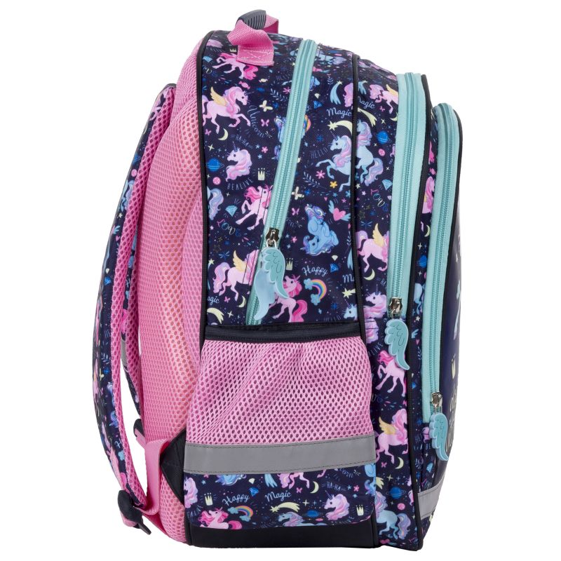 Ученическа раница с две отделения и просторен преден джоб. Отстрани има два странични джоба, завършени с мрежа. Раницата е с меки подплатени презрамки, ергономичен гръб, светлоотразителни ленти, подсилена дръжка и подсилено дъно.