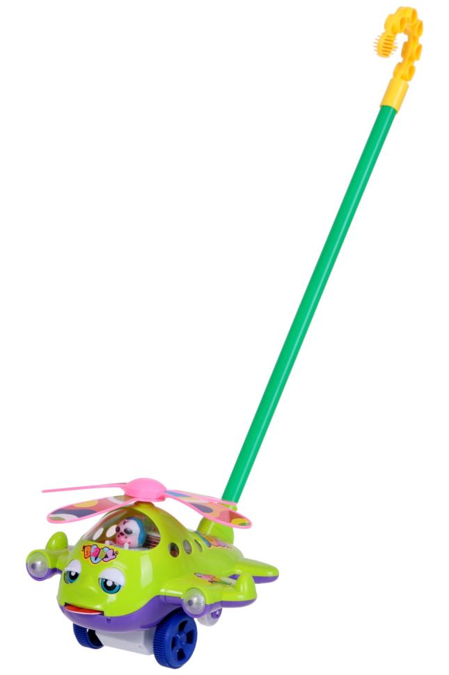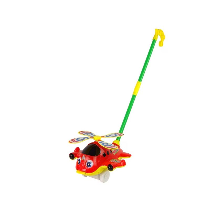 Играчка за бутане Въртолет При бутане издава дрънкащ звук и плези език. Два цвята - червен и зелен Размери 18х17х50 см